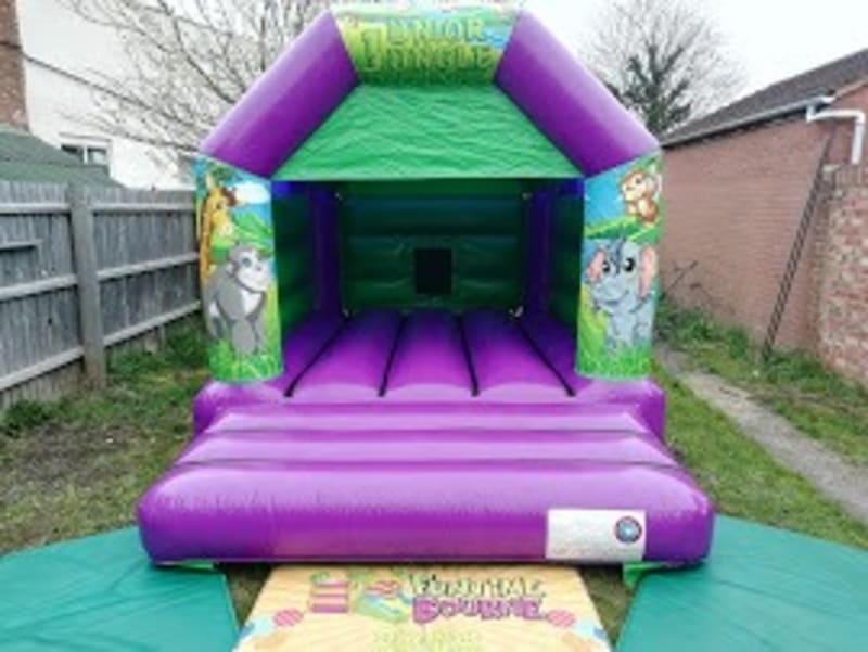 It was about 10 a.m. on Saturday morning when we got a phone call from a panicking lady, she had a bouncy castle booked with another company who had refused to deliver the inflatable . We never really got to the bottom of what the problem was, as we found no issue with the access, for garden itself was plenty large enough, the lady was very polite and reasonable so we really don't know what the problem was with the original booking . However we got the phone call at 10 a.m. on Saturday from the lady who had been let down by another company and was desperately trying to find a bouncy castle to hire for the day. The party was set to start in 2 hours, so with little time to lose, we finish the delivery that we are on and immediately ran by our unit to collect another bouncy castle. The lady chose our Jungle theme A frame bouncy castle which is ideal as the roof provides the sunshade but also a shower cover in case of light rain and fit the garden perfectly.